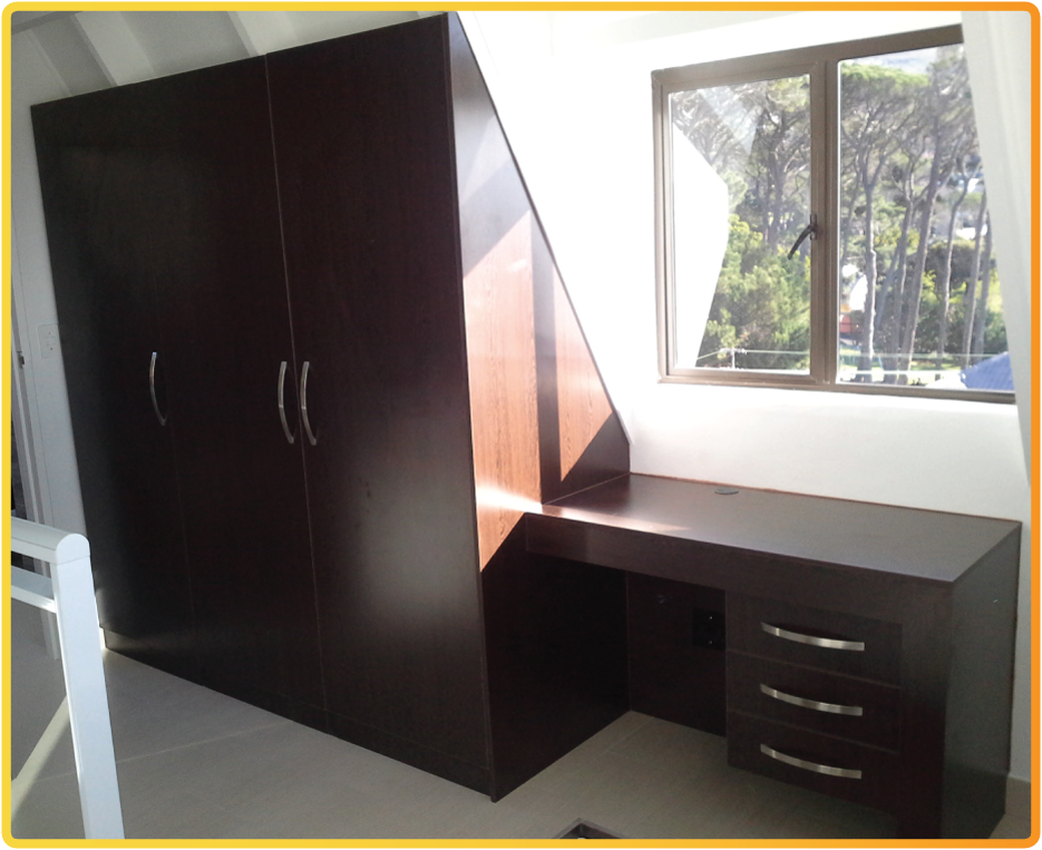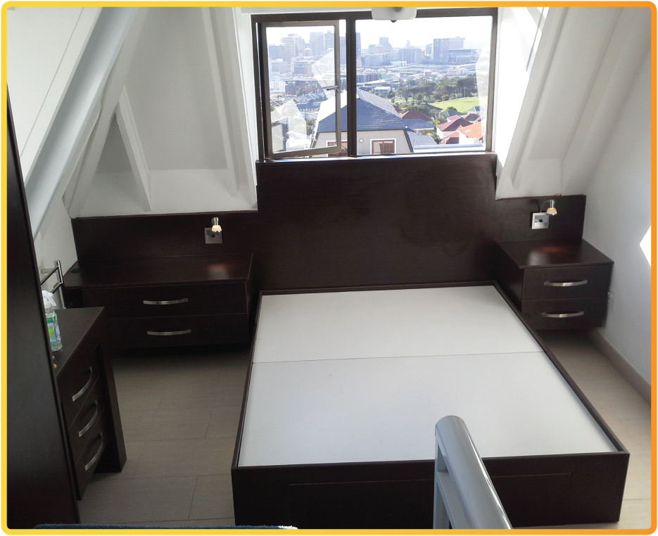 A small apartment in Vredehoek had no other option but to have the bedroom in the upstairs attic. The layout of the built-in units was drawn up by an interior designer who trusted our ability to build these items in a very confined space.